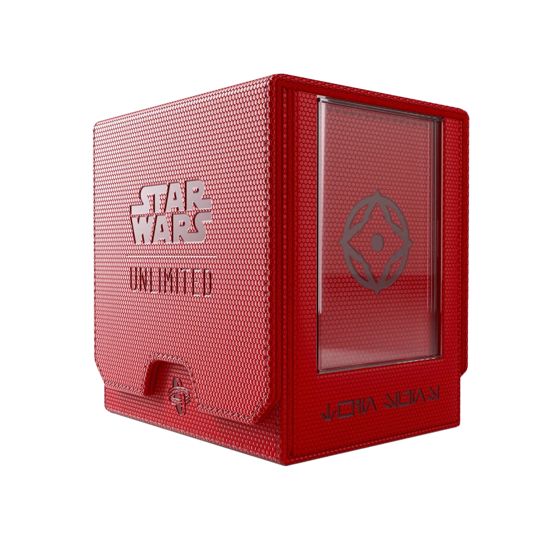 The brand-new TWIN SUNS Deck Pod, an officially licensed premium deck box, is specifically designed for the popular Star Wars™: Unlimited Twin Suns format. UNIQUE FEATURE: The TWIN SUNS Deck Pod includes not 1 but 2 Slide Card Cases with additional UV protection for keeping the two required Leader cards safe. Due to the innovative placement of that cards, the stored deck can be easily identified without opening the box. Both Slide Card Cases can be detached and used during gameplay. The TWIN SUNS Deck Pod stores up to 100 double-sleeved cards horizontally. In addition, the base card has its own designated pocket, thus being instantly ready for play. The integrated drawer holds all necessary tokens and additional accessories. The flap of the TWIN SUNS Deck Pod is equipped with our highly rated CONVERTIBLE system. Strong magnets keep the setup stable and close the box safely.